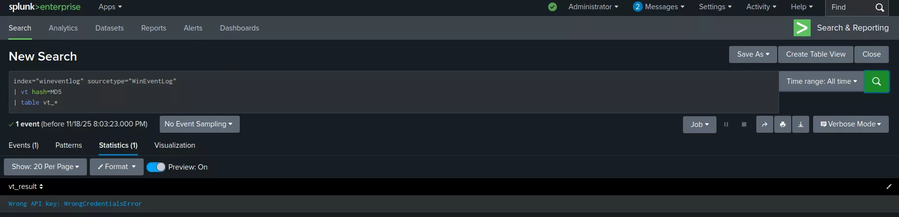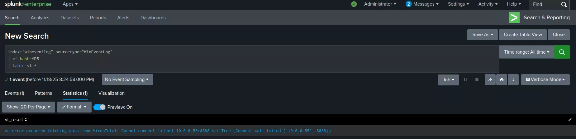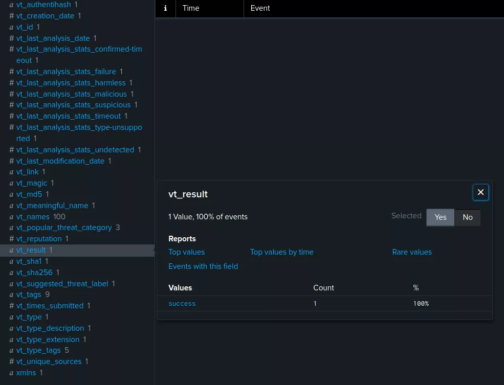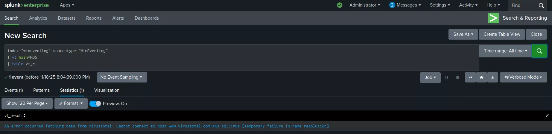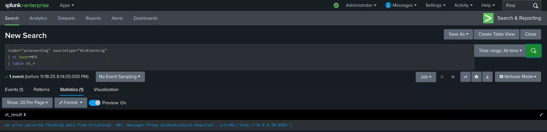 Error messages returned by VirusTotal Splunk AppThis section provides guidance on how to diagnose and resolve common issues when using the vt command from the VirusTotal App for Splunk. When the vt command is executed in an SPL search, it always returns a field named vt_result in the output.If the command completes successfully, the value of vt_result will be: success If the command fails, vt_result will contain an error message describing the reason for the failure. Common errors includeIncorrect API Token configuration This occurs when the API Token is missing, invalid or incorrectly copied. The app is unable to authenticate against the VirusTotal API, causing the request to fail. Example:Incorrect Proxy configuration Triggered when the proxy settings (protocol, host, or port) are incorrect or point to a server that cannot be reached from the Splunk environment. As a result, the request cannot be routed properly. Example:Proxy requiring authentication (username/password) If the environment uses a proxy that requires authentication, but the app is not configured with a username and password, the proxy rejects the request, preventing communication with VirusTotal. Example:Network issues or timeout during the request Caused by general connectivity issues such as firewall restrictions, DNS problems, high latency, slow proxy response, or temporary outages. The request exceeds the timeout threshold or cannot reach the VirusTotal API. Example: